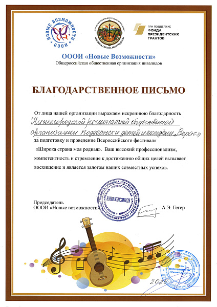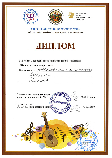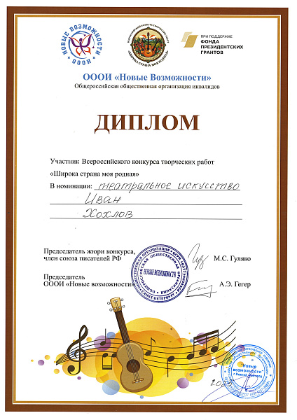НРООПДИМ «Верас» награждена Благодарственным письмом за содействие в организации Всероссийского конкурса «Широка страна моя родная», а каждый участник получил Диплом в номинации «Театральное искусство»: Аносова Елизавета, Алексей Алексеев, Иван и Михаил Хохловы.